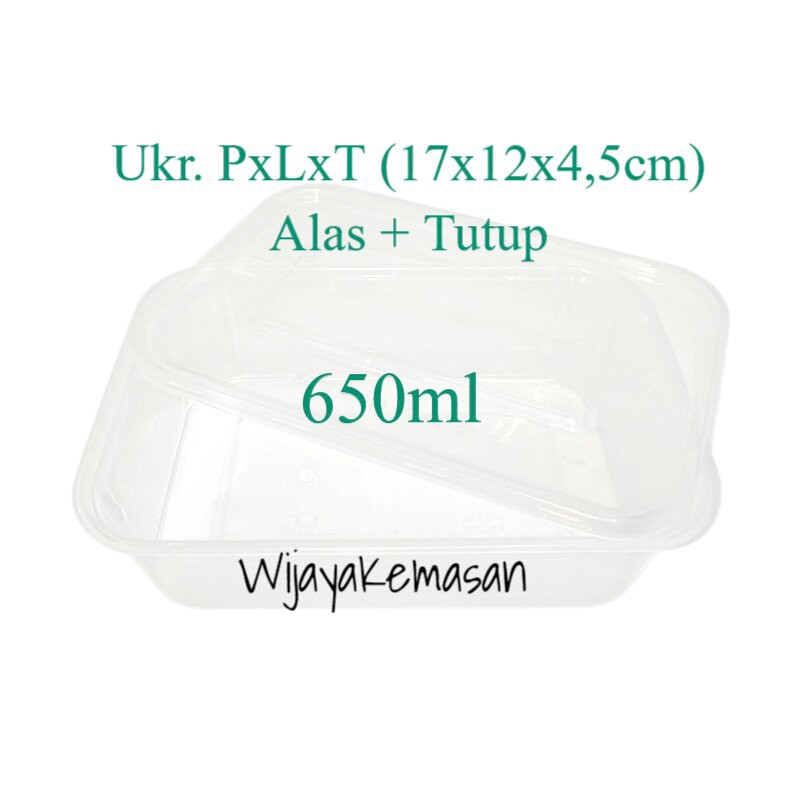 Tempat Makanan Plastik 650ml - 1pack isi 25 set alas + tutup- memiliki kapasitas 650ml = 585gram- PxLxT : 17x12x4,5cm- ketebalan 0,5mm- bahan FoodG