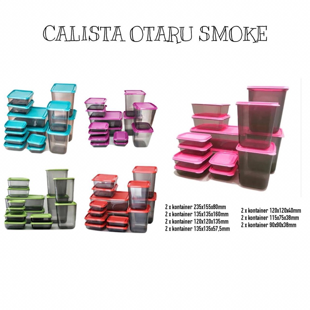MOHON DIBACA SEBELUM MEMESANHARAP MENYERTAKAN WARNA YANG DIPESAN DAN JUGA WARNA CADANGAN APABILA WARNA YANG DIINGINKAN HABIS.Isi:* 2 x Kontainer 235x155x80 mm* 2 x Kontainer 135x135x160 mm* 2 x Kontainer 120x120x135 mm* 2 x Kontainer 135x135x57,5 mm* 2 x Kontainer 120x120x40 mm* 2 x Kontainer 115x75x38 mm* 2 x Kontainer 90x90x38 mmSpesifikasi :- Bebas BPA (BPA Free)- Bisa Digunakan Dalam Microwave dan Freezer- Variasi ukuran lengkap- Praktis & hemat tempat- Polypropylene Plastic- Mudah dibawaBebas BPA (Bahan penyebab Kanker)BPA dikenal sebagai salah satu zat yang memicu timbulnya kanker dan gangguan hormon, khususnya bagi anak-anak. Namun, Anda tidak perlu khawatir, Sealwear keluaran Calista bebas BPA sehingga keluarga Anda pun terlindungi dari bahaya yang mungkin muncul. Sealwear Calista juga dibuat dari Polypropylene yang tidak mengandung bahan kimia yang berbahaya bagi Anda dan keluarga.Bisa Digunakan Dalam MicrowaveDibuat khusus dari bahan plastik polipropilen, kontainer makanan keluaran Calista ini aman untuk digunakan dalam berbagai kondisi. Sealwear ini dibuat khusus supaya bisa digunakan di microwave tanpa mengubah susunan kimia yang bisa menjadi racun bagi tubuh. Selain itu, sealwear ini juga bisa digunakan untuk menyimpan berbagai jenis makanan di kulkas maupun di freezer.No retur, cancel dan komplain.Barang segel pabrik dan dipacking aman jadi tidak ada komplain kurang isi.#calista #calistaotaru #calistasmoke #dapur #container #t